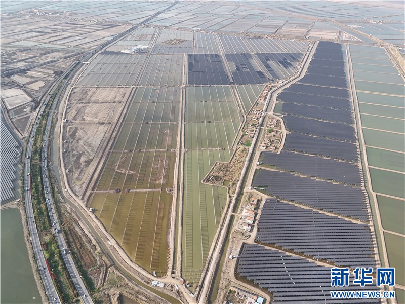 近日,在連云港經(jīng)濟(jì)技術(shù)開發(fā)區(qū)猴嘴街道三峽青口鹽場,近78萬塊光伏板如波浪般起伏,深藍(lán)色板面倒映著魚塘的波光,蔚為壯觀。