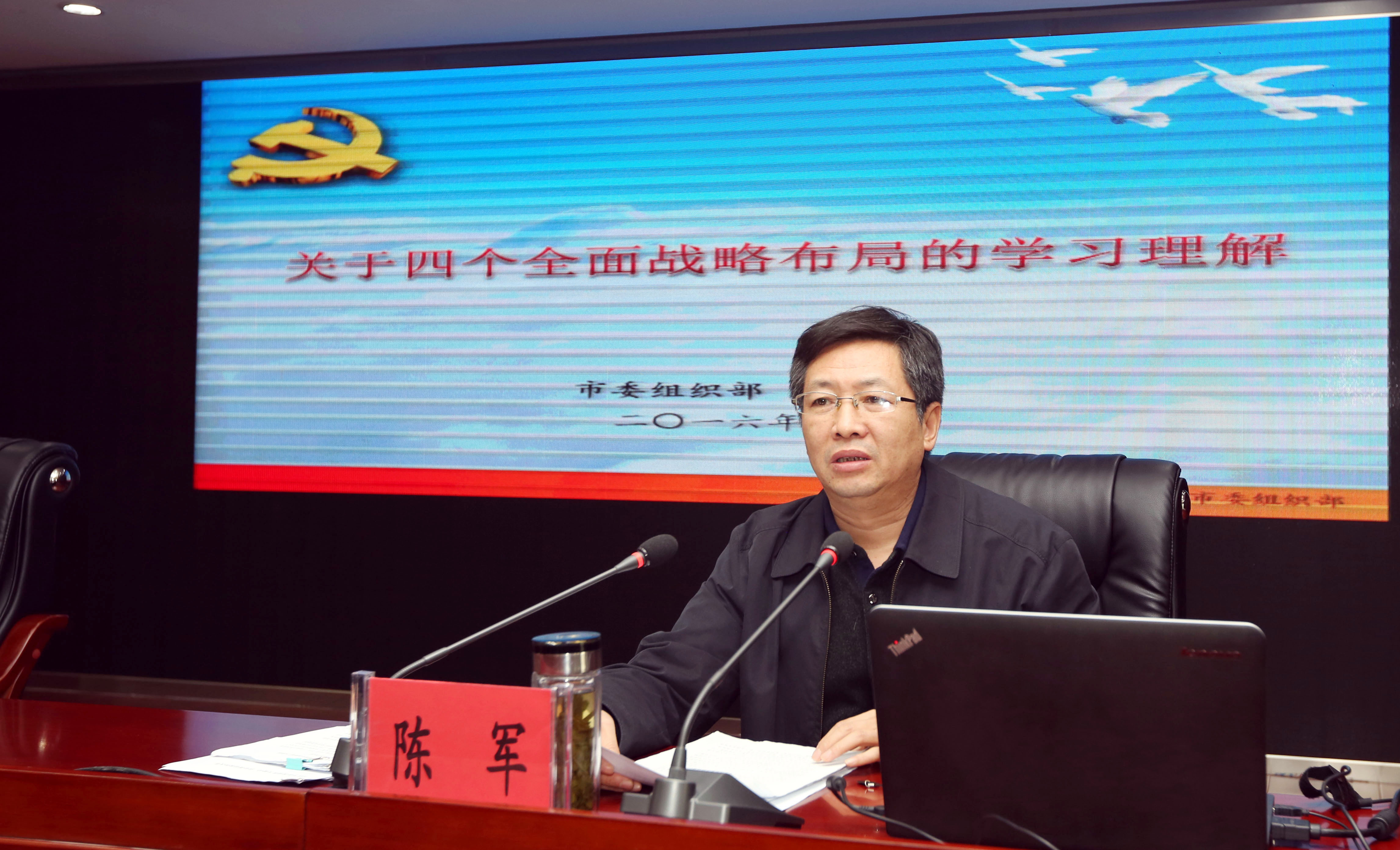 11月4日下午,集團(tuán)公司黨委召開(kāi)中心組學(xué)習(xí)(擴(kuò)大)會(huì),邀請(qǐng)市委組織部副部長(zhǎng)、市委黨建辦主任、組織員辦公室主任陳軍就“四個(gè)全面”的學(xué)習(xí)和理解作專(zhuān)題輔導(dǎo)報(bào)告。集公司黨委書(shū)記、董事長(zhǎng)楊龍主持會(huì)議,集團(tuán)公司領(lǐng)導(dǎo)班子成員,各權(quán)屬單位領(lǐng)導(dǎo)班子成員、黨群有關(guān)部門(mén)負(fù)責(zé)人,集團(tuán)總部全體管理人員參加會(huì)議。