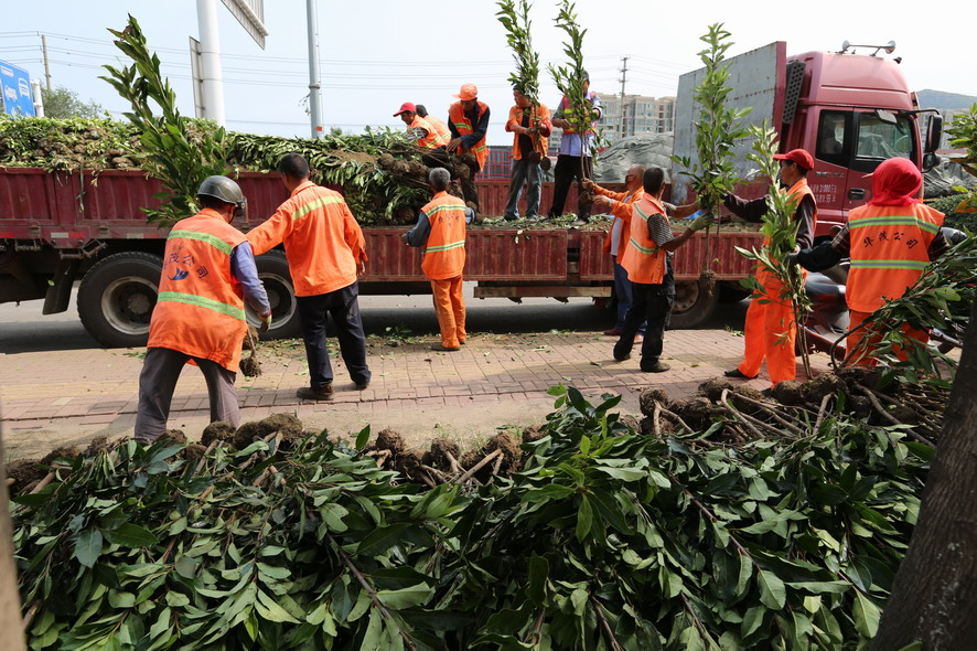 新光路鐵路橋至港城大道段南側綠化帶,因為人為踩踏、車輛碾壓導致綠化斑禿損壞嚴重,為盡快恢復綠化原貌,改善市容市貌。8月18日,裕升、裕欣養(yǎng)護公司組織80多名綠化工,從早上6點一直干到下午6點,卸苗、運苗、挖坑、插苗,烈日酷暑下奮戰(zhàn)一整天,中午在樹陰下吃點盒飯,喝點礦泉水,繼續(xù)工作,橘黃色工作被汗水浸透、被烈日烤干,這樣有好幾個來回?!敖裉煳覀円谶@片綠化補植紅葉石楠、金森女貞等模紋小苗1萬余株,紅葉石楠球等灌木110株,有效改善該路段綠化植被,提升城市形象,我們還要在黃海續(xù)道補植草坪近30000平方,在這條1000多米長的路段,有車輛維修點50多家,車輛出入,對路邊綠化帶傷害非常大,這一路段也是環(huán)衛(wèi)整治長期存在的‘老大難’,這次,在開發(fā)區(qū)行政執(zhí)法部門的配合下,我們要重新種植草坪,對這一‘老大難’路段植被進行恢復,另外德蘭南路、東路補植苗木近80萬元的綠化工程也已開工上土整土,接著要栽苗,根據(jù)開發(fā)區(qū)創(chuàng)衛(wèi)部署要求,上述這些事情必須在8月底完成,所以說時間相當緊,職工們都冒著高溫,加班加點搶進度?!惫靖笨偨?jīng)理郁宏峰說。