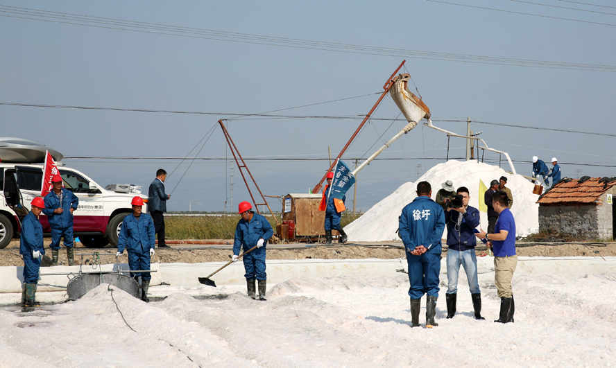 攝制組動用直播車、航拍、信號傳輸+高清攝像機等設備,工作人員各有分工,同步拍攝鹽田生產(chǎn)、鹽工勞動以及食鹽生產(chǎn)等淮鹽收獲的喜人畫面,記者更是在鏡頭的一路跟拍下,一邊自己動手操作,一邊與現(xiàn)場勞動的鹽工親切交談,向觀眾詳細解讀生態(tài)淮鹽灘曬生產(chǎn)和食鹽生產(chǎn)的工藝流程,為大家熟悉、了解和保護淮鹽提供一次直觀的認知機會。