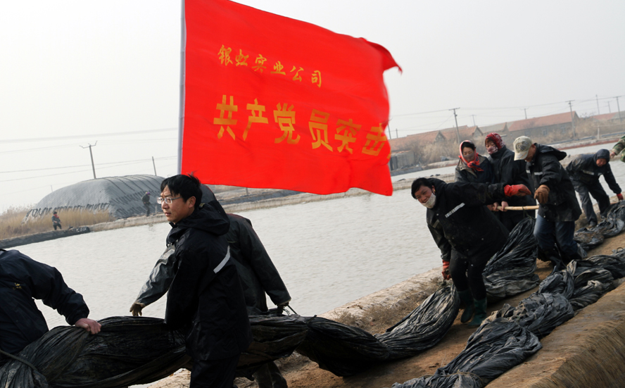 11月16日,一面紅色的黨員志愿者服務(wù)隊(duì)隊(duì)旗在陽(yáng)光下飄展,在一片雪白結(jié)晶池埝的映襯下,顯得格外鮮艷。徐圩投資公司深港服務(wù)區(qū)12名黨員志愿者頂著寒冷的晨風(fēng),緊忙趕往新灘服務(wù)區(qū)原料鹽基地建設(shè)現(xiàn)場(chǎng),幫助其12個(gè)單元搶裝池埝土工布,也為這個(gè)冬天添加幾許新鮮的氣息。