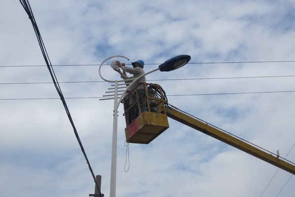 圖為工人們?cè)趽屝蘼窡?/FONT> 日前,青口供電所為青口鹽場烘托中秋、國慶“兩節(jié)”氣氛,美化、亮化街道環(huán)境,在人力緊張的情況下,抽出6名職工,利用兩天時(shí)間,義務(wù)搶修路燈70余盞。(宋中文)