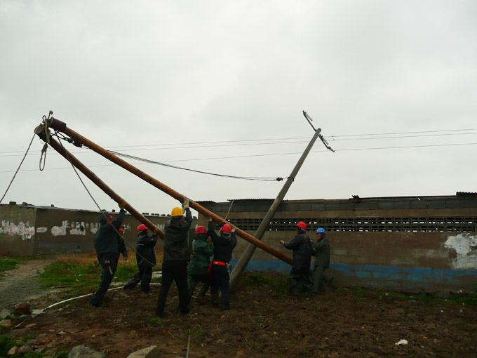 2月3日(正月初九)早上五點多,臺北供電所電力搶修值班室電話急促響起,變電所操作工反映10KV太和線跳閘失電。10KV太和線是臺北供電所非常重要的一條供電線路,是向順天木業(yè)、蘇交集團、市政瀝青等大型企業(yè)供電的重要通道,失電意味著企業(yè)生產(chǎn)停工。接警后,供電所外線組組長孫忠青立刻帶人沿線全面檢查。經(jīng)過兩個小時的排查,終于發(fā)現(xiàn)處于線路末端的高速公路低壓線路的五根電桿被施工的挖掘機 撞斷拉折。獲此情況,所領(lǐng)導(dǎo)立即組織人員,準備材料,協(xié)調(diào)吊車,安排運送電桿。這時天空正下著小雨,更增加了施工的難度。為了盡快搶修,恢復(fù)供電,搶險隊伍加速向事發(fā)地點開進,寒風中的雨滴,打在職工的頭上臉上,大家毫不在意,一心撲在搶修線路上。運送電桿的道路泥軟地陷,機器吊裝遇到死角,他們就肩扛手拉。為了搶時間,爭速度,他們中午就在工地吃點快餐。在全體職工的共同努力下,到下午五點左右全面完成了搶險工作。