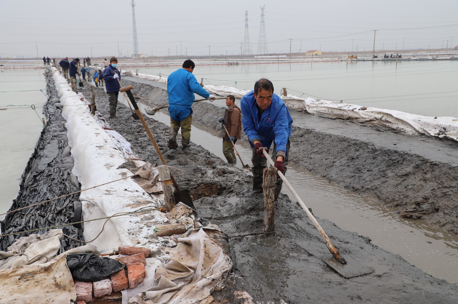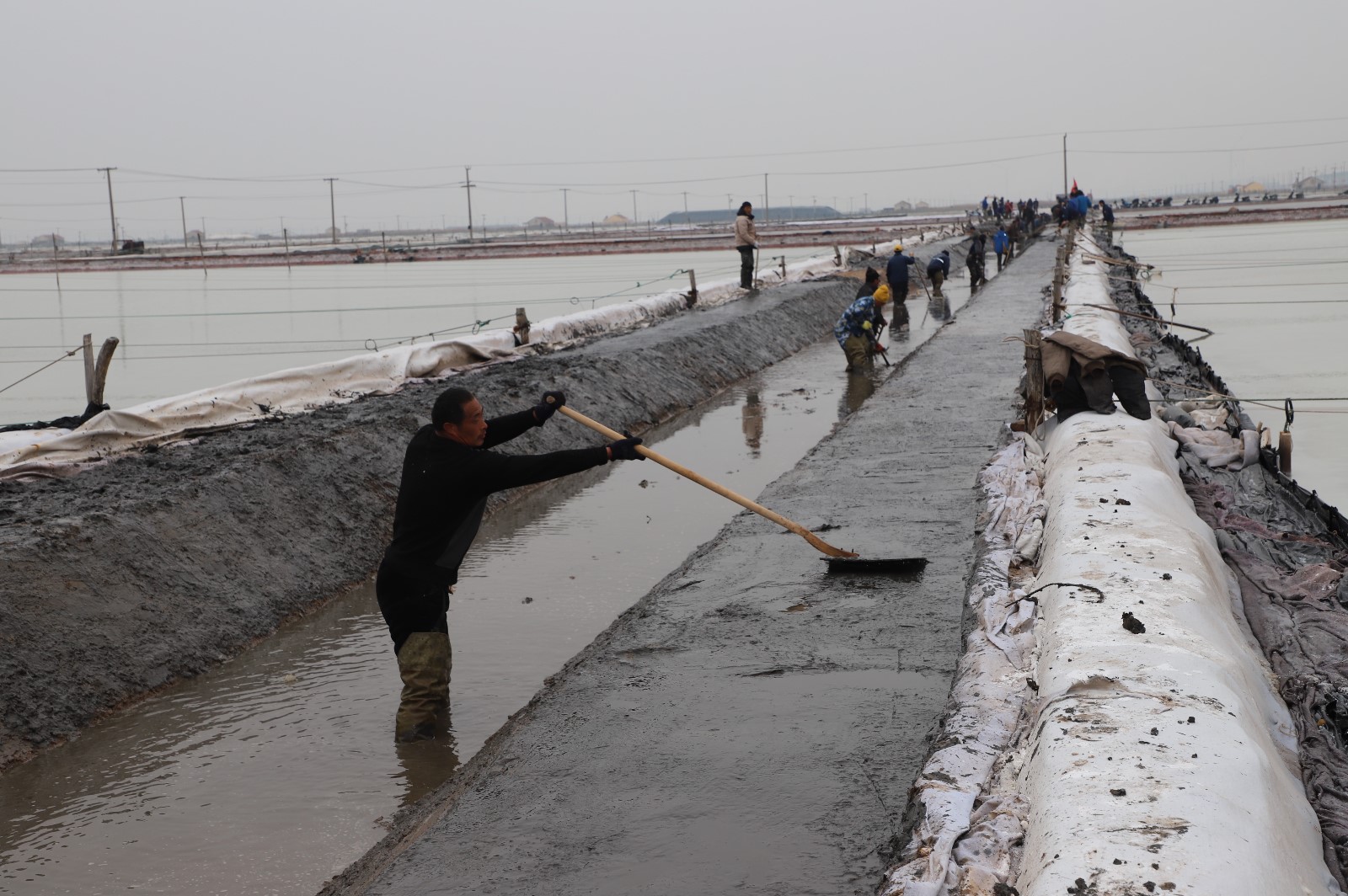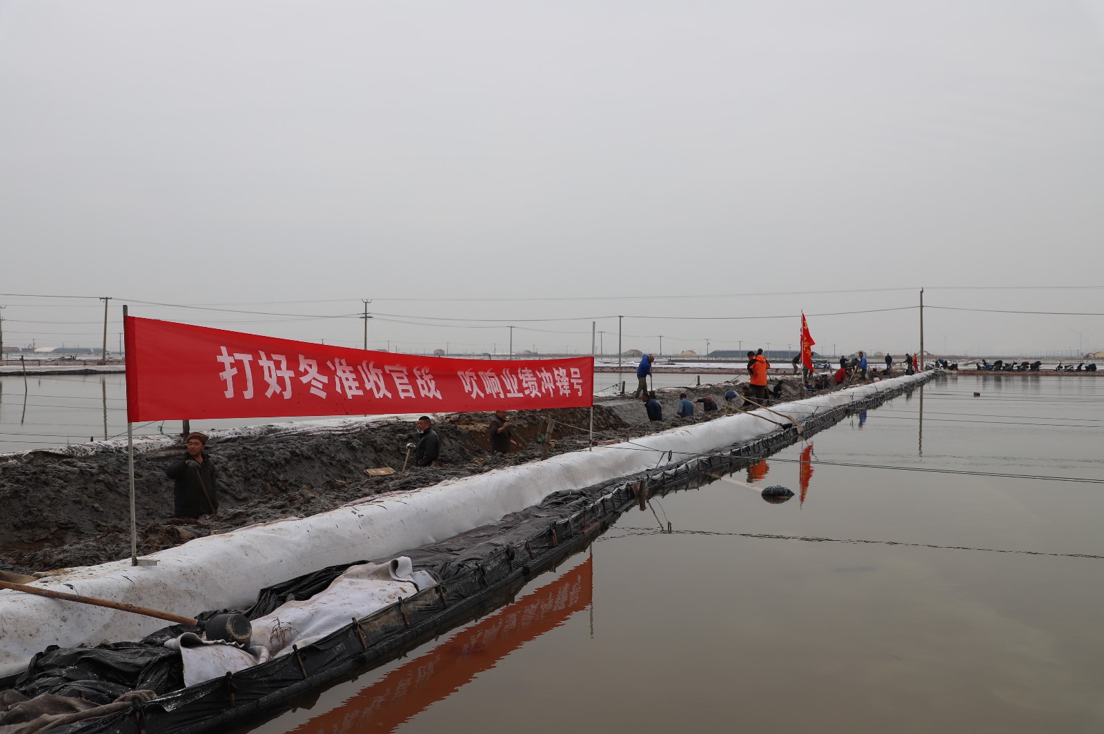在新河制鹽分公司鹽田地頭的冬準(zhǔn)會(huì)戰(zhàn)現(xiàn)場(chǎng),人頭攢動(dòng),工人們正動(dòng)作嫻熟的進(jìn)行澆水、翻泥、踩實(shí)、做埝、整平……,鹽工們?nèi)?zhēng)先進(jìn)位,手腳不停的揮鍬挖泥,呈現(xiàn)出你追我趕、比肩發(fā)力的勞動(dòng)場(chǎng)景。一條條溝道改造、格堰修整等亮化灘場(chǎng)文明建設(shè)煥然一新,一幅幅“人勤春早”的美麗畫(huà)卷徐徐展開(kāi)。