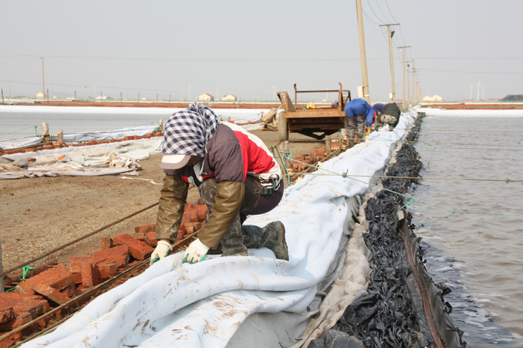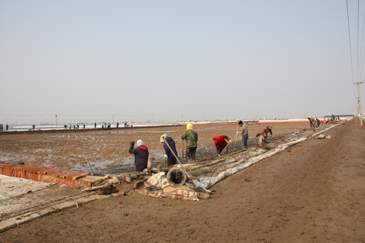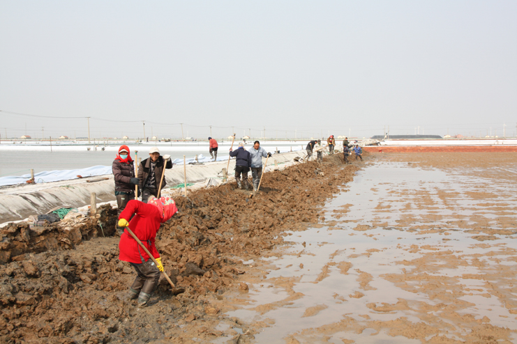 3月21日,在新河制鹽分公司八班的一期結(jié)晶區(qū),一片火熱景象,只見大家正在灘內(nèi)揮膀大干,挖泥的、和泥的、打堰的,配合密切,運(yùn)作熟練,參加勞動(dòng)的職工足有50余人。“為了加快食用原料海鹽基地建設(shè)進(jìn)度,今天,我們集中了7個(gè)組班的員工幫助八班維修下馬格格堰,爭(zhēng)取早日灌池生產(chǎn)。”正在工作現(xiàn)場(chǎng)安排工作的該公司經(jīng)理安樹林說道。