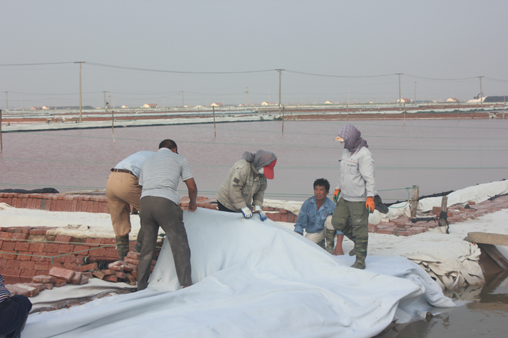 隨后我們又來到了新河制鹽分公司十四班的裝鹽現(xiàn)場(chǎng)。一位工人操作著挖掘機(jī),往卡車上裝鹽銷售,如今裝鹽實(shí)現(xiàn)了機(jī)械化,工人的勞動(dòng)負(fù)荷也減輕了許多。在埒南制鹽分公司的五班,我們看到七八個(gè)工人正在灘頭更換土工布,他們一字排開,先將土工布鋪開,然后分工合作,有的人負(fù)責(zé)把布理齊鋪平,有的則把磚頭鋪放在布上用來固化。