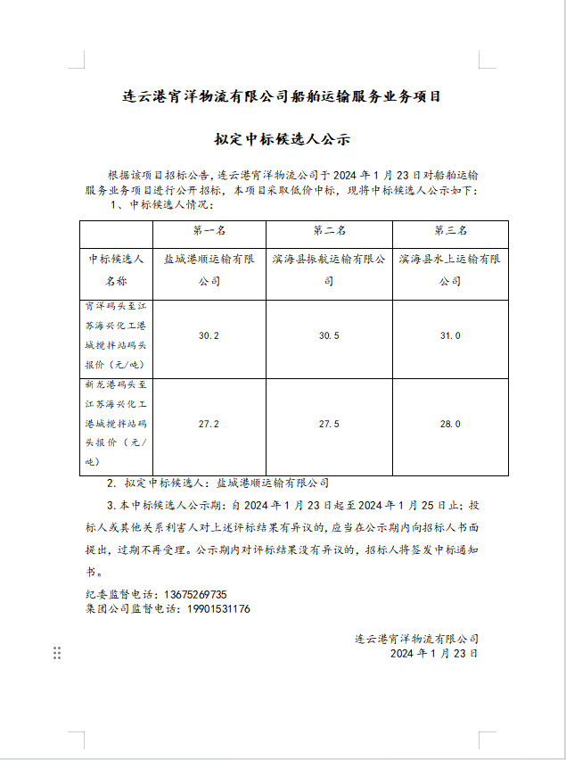 連云港宵洋物流有限公司船舶運輸服務(wù)業(yè)務(wù)項目擬定中標(biāo)候選人公示