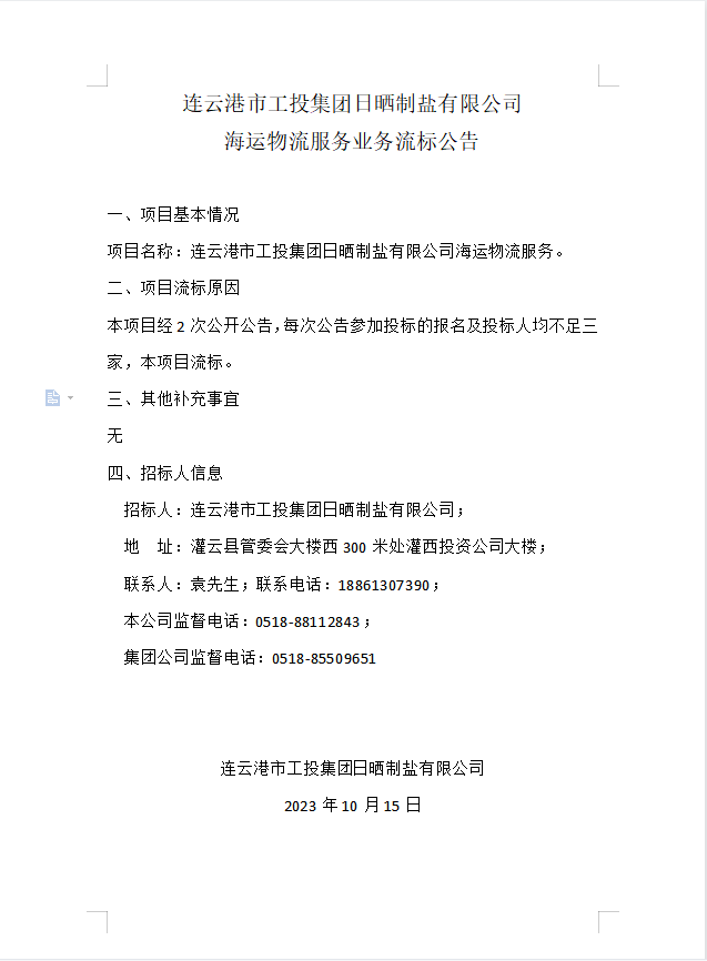 連云港市工投集團(tuán)日曬制鹽有限公司海運(yùn)物流服務(wù)業(yè)務(wù)流標(biāo)公告