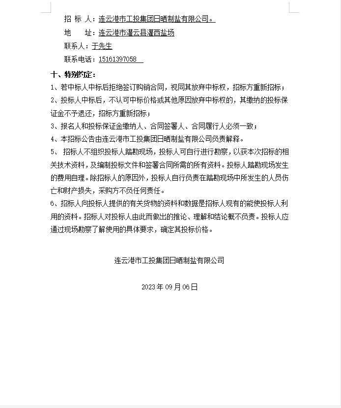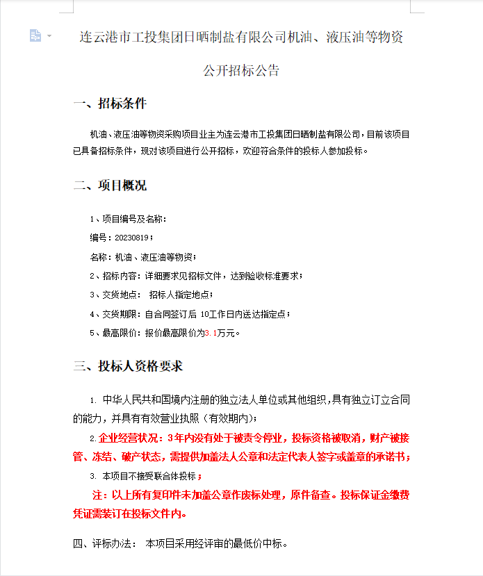 連云港市工投集團(tuán)日曬制鹽有限公司機(jī)油、液壓油等物資公開(kāi)招標(biāo)公告