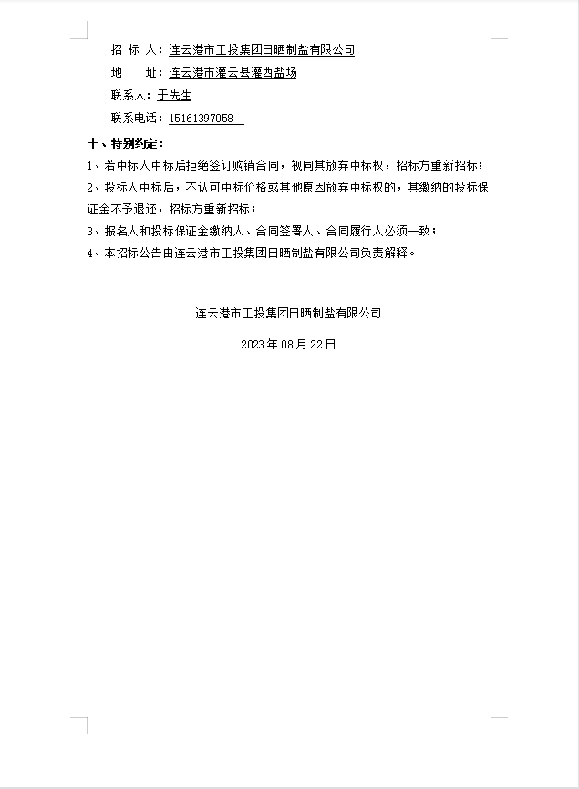 連云港市工投集團(tuán)日曬制鹽有限公司PE管采購公告