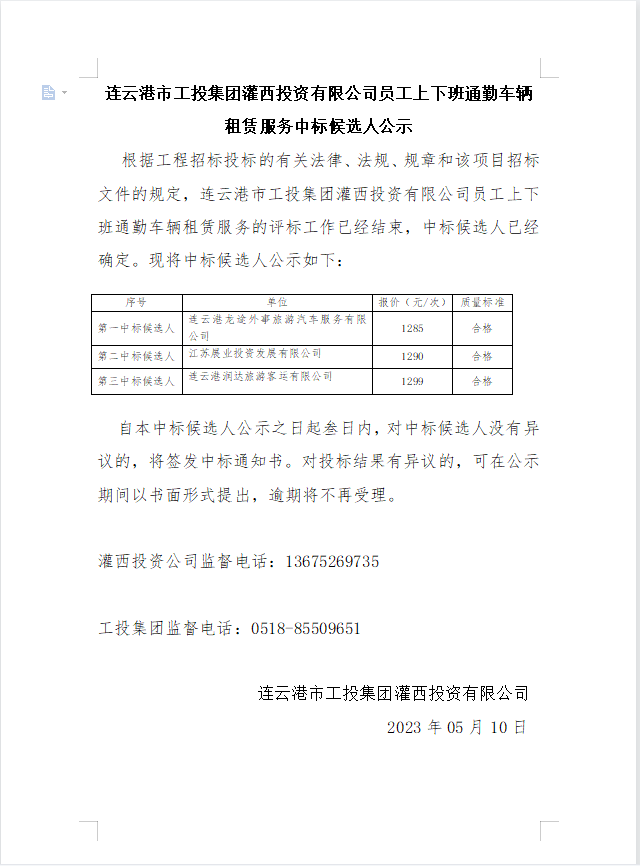 連云港市工投集團灌西投資有限公司員工上下班通勤車輛租賃服務中標候選人公示
