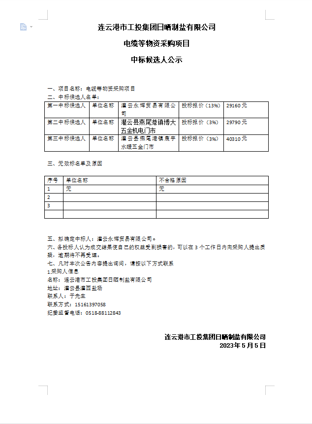 連云港市工投集團(tuán)日曬制鹽有限公司電纜等物資采購項(xiàng)目中標(biāo)候選人公示