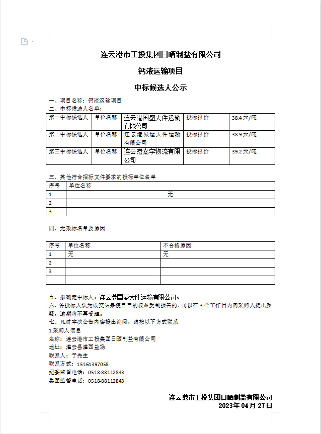 連云港市工投集團日曬制鹽有限公司鈣液運輸項目中標候選人公示