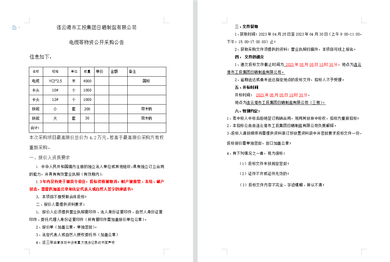 連云港市工投集團日曬制鹽有限公司電纜等物資公開采購公告