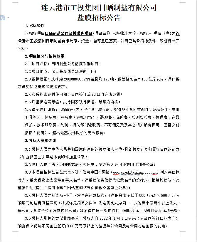 連云港市工投集團(tuán)日曬制鹽有限公司鹽膜招標(biāo)公告