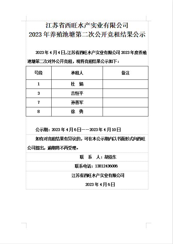 江蘇省西旺水產(chǎn)實(shí)業(yè)有限公司2023年養(yǎng)殖池塘第二次公開競(jìng)租結(jié)果公示