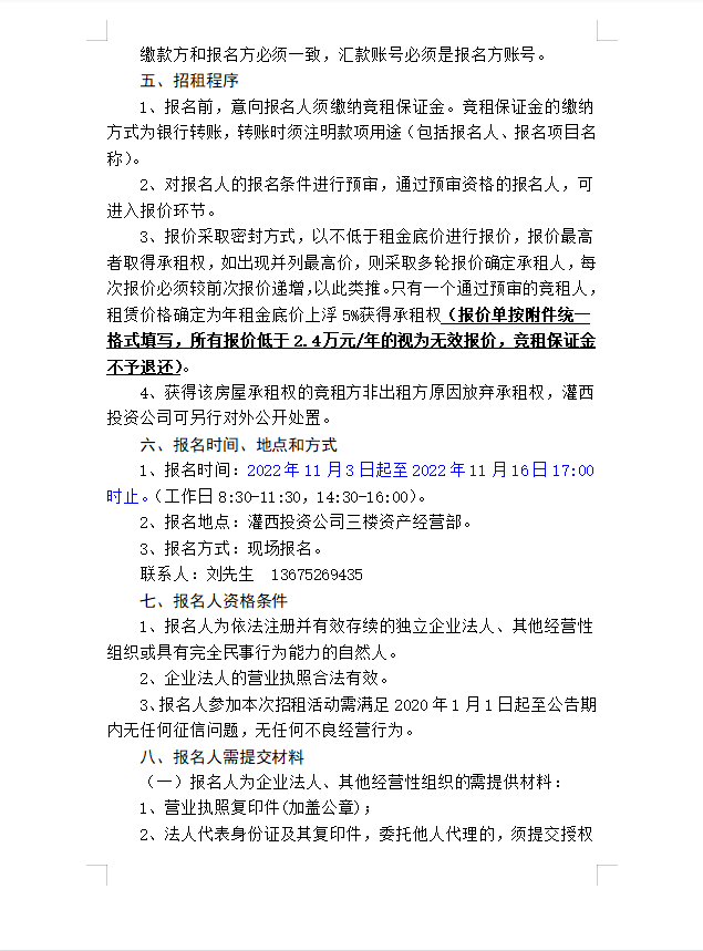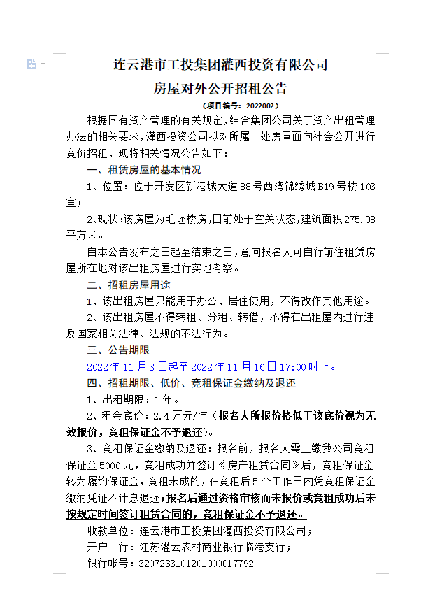 連云港市工投集團灌西投資有限公司房屋對外公開招租公告