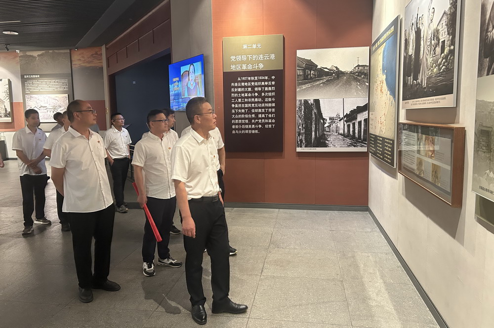 在連云港市革命博物館莊嚴(yán)肅穆的展廳內(nèi),大家認(rèn)真聆聽(tīng)講解員講述連云港地區(qū)的革命斗爭(zhēng)史。一件件珍貴的歷史文物、一幅幅生動(dòng)的歷史照片,再現(xiàn)了革命先烈們?yōu)槊褡褰夥攀聵I(yè)英勇奮斗的光輝歷程。在革命烈士浮雕前,全體黨員整齊列隊(duì),重溫入黨誓詞,強(qiáng)化政治信仰,增強(qiáng)責(zé)任擔(dān)當(dāng)。