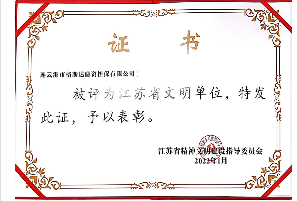 1月,格斯達(dá)擔(dān)保公司被省精神文明建設(shè)指導(dǎo)委員會評為“江蘇省文明單位”稱號。