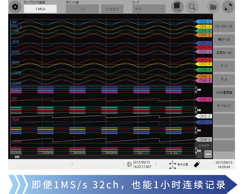 32ch同時(shí)測(cè)量時(shí),即便采樣速度1MS/s,也能實(shí)現(xiàn)1小時(shí)左右的連續(xù)測(cè)量。