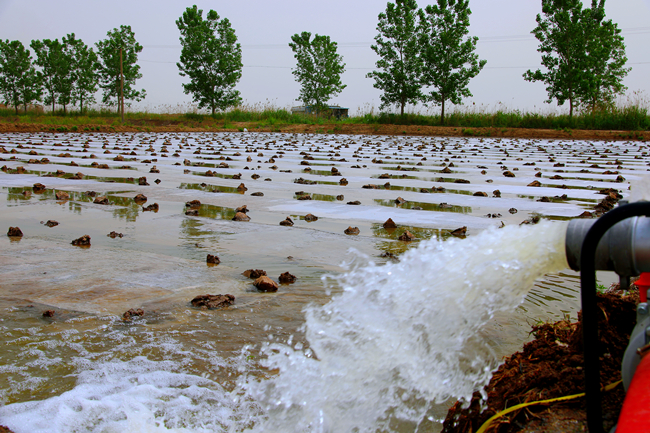▲塑盤育秧后進(jìn)入秧苗管理期,條田管理工正引水灌溉,全力做好保苗護(hù)苗工作,為下一步序時推進(jìn)插秧工作打下基礎(chǔ)。
