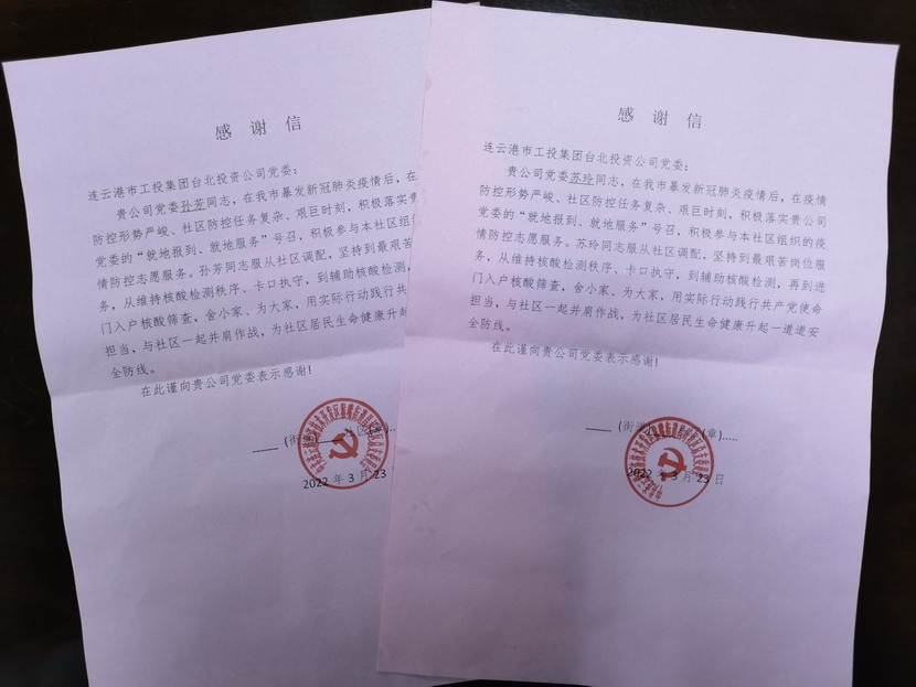 “臺(tái)北投資公司的黨員同志們視疫情防控為己任,服從調(diào)度安排,站好每一班崗,不僅認(rèn)真履行防控職責(zé),又創(chuàng)新開(kāi)展疫情防控教育宣傳、便民服務(wù)等多項(xiàng)活動(dòng),成為我們社區(qū)防疫攻堅(jiān)的主力軍。”3月25日,收到開(kāi)發(fā)區(qū)猴嘴街道昌圩社區(qū)送來(lái)的一份特殊的“禮物”— 一封疫情防控感謝信,感謝臺(tái)北投資公司黨員蘇玲、孫芳等同志在新冠肺炎疫情防控的關(guān)鍵階段挺身而出、伸出援手,參與協(xié)助社區(qū)的疫情防控工作。
