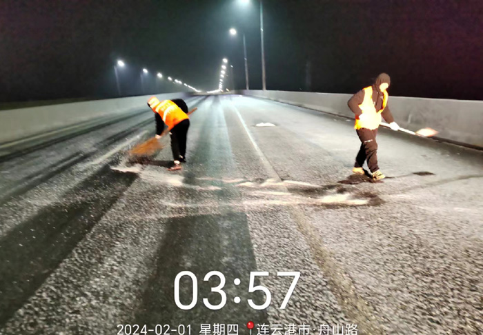 截止早上7點(diǎn),悅升公司共出動(dòng)機(jī)械設(shè)備10臺(tái)、人員260余人,對(duì)橋梁和重點(diǎn)結(jié)冰地段使用融雪劑150余噸,及時(shí)消除路面冰凍隱患100余處。