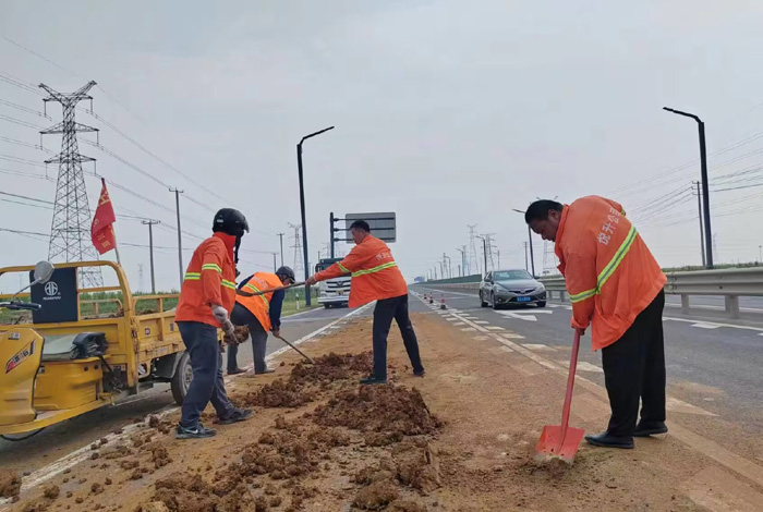 7月27日上午,臨近下班之時(shí),該分公司228省道班長姚功,接到公司應(yīng)急處理電話,疏港大道向西路面近1500多米長,車輛拋灑嚴(yán)重影響往來車輛安全經(jīng)過。正在下班的途中他二話沒說,調(diào)轉(zhuǎn)車頭奔赴事發(fā)地點(diǎn)疏港大道,迅速擺開安全錐,揮動(dòng)手中鐵銑開始突擊清理路面上礦土,石塊。聞?dòng)嵉弥耸拢伯a(chǎn)黨員紀(jì)樹好,胡可貴,班組成員孫洪召等同志二話沒說,一并趕往現(xiàn)場支援,橙色工作服在陽光照耀下顯得格外靚麗。工作現(xiàn)場,遇到大的石塊他們就用手搬,小的、碎的就用鐵锨和掃把清理,中午的陽光火辣辣的,他們就這樣頂著烈日奮戰(zhàn)近兩個(gè)多小時(shí),共轉(zhuǎn)運(yùn)礦土泥塊、石子近10余車,高質(zhì)高效保障了核心道路車輛安全通行。(楊波)